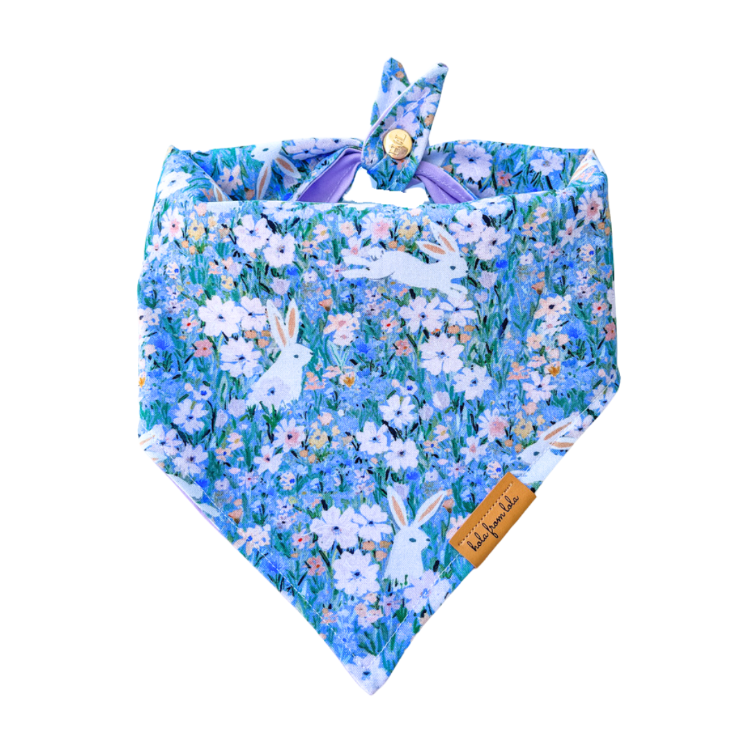 Where whimsical design meets springtime joy. Crafted with love, this charming accessory features frolicking white bunnies against a vibrant purple backdrop, perfectly capturing the essence of spring. It's not just a bandana; it's a celebration of renewal and playfulness for your pup this spring!
